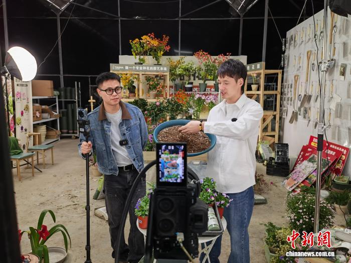 图为11月11日,正在浙江省桐城市崇祸镇的崇祸农创园,别名农创客经由过程脚机曲播卖售绿植。王劳飞 摄